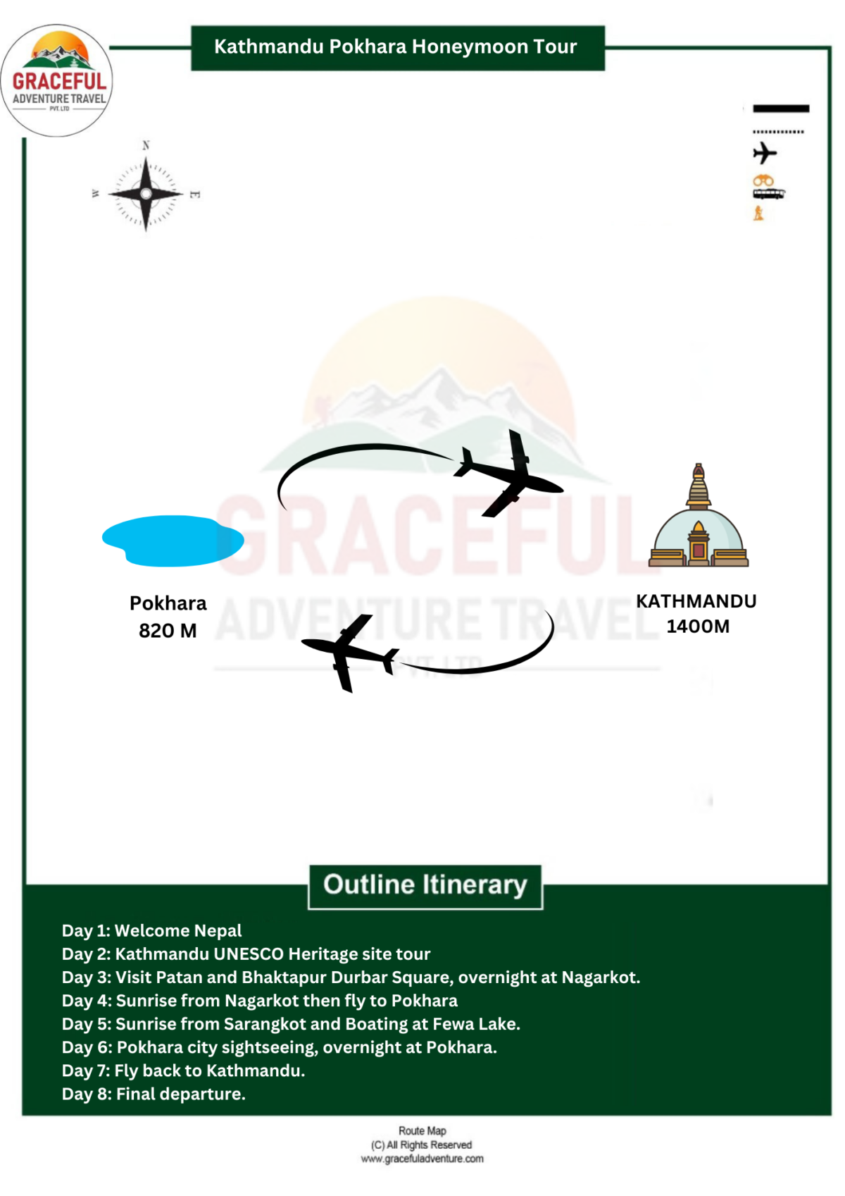 During your romantic honeymoon tour from Kathmandu to Nagarkot and Pokhara, transportation options will play a vital role in ensuring a seamless and memorable experience. Graceful Adventure, offers a combination of land and air transport to enhance your journey’s comfort and convenience.