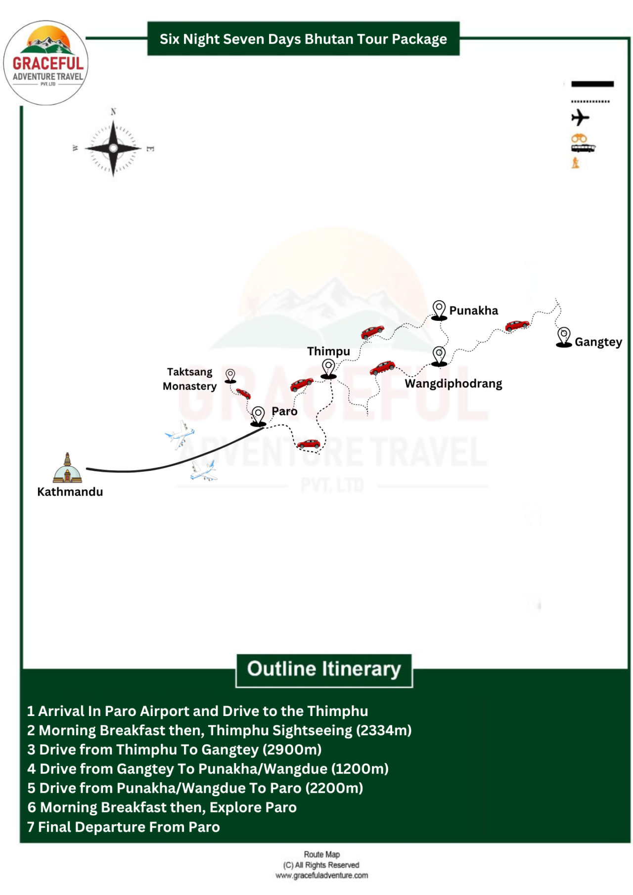 Six Night Seven Days Bhutan Tour Package offers a perfect blend of adventure, culture, and nature which was organize by Graceful Adventure Travel from Kathmandu and all around the world. You’ll explore Thimphu, Punakha, and Paro, visiting iconic landmarks like Tashichho Dzong, Buddha Dordenma Statue, and the Tiger’s Nest Monastery. This Bhutan holiday tour guarantees a lifetime experience with breathtaking views, cultural heritage, and friendly locals, perfect for national and international tourists .