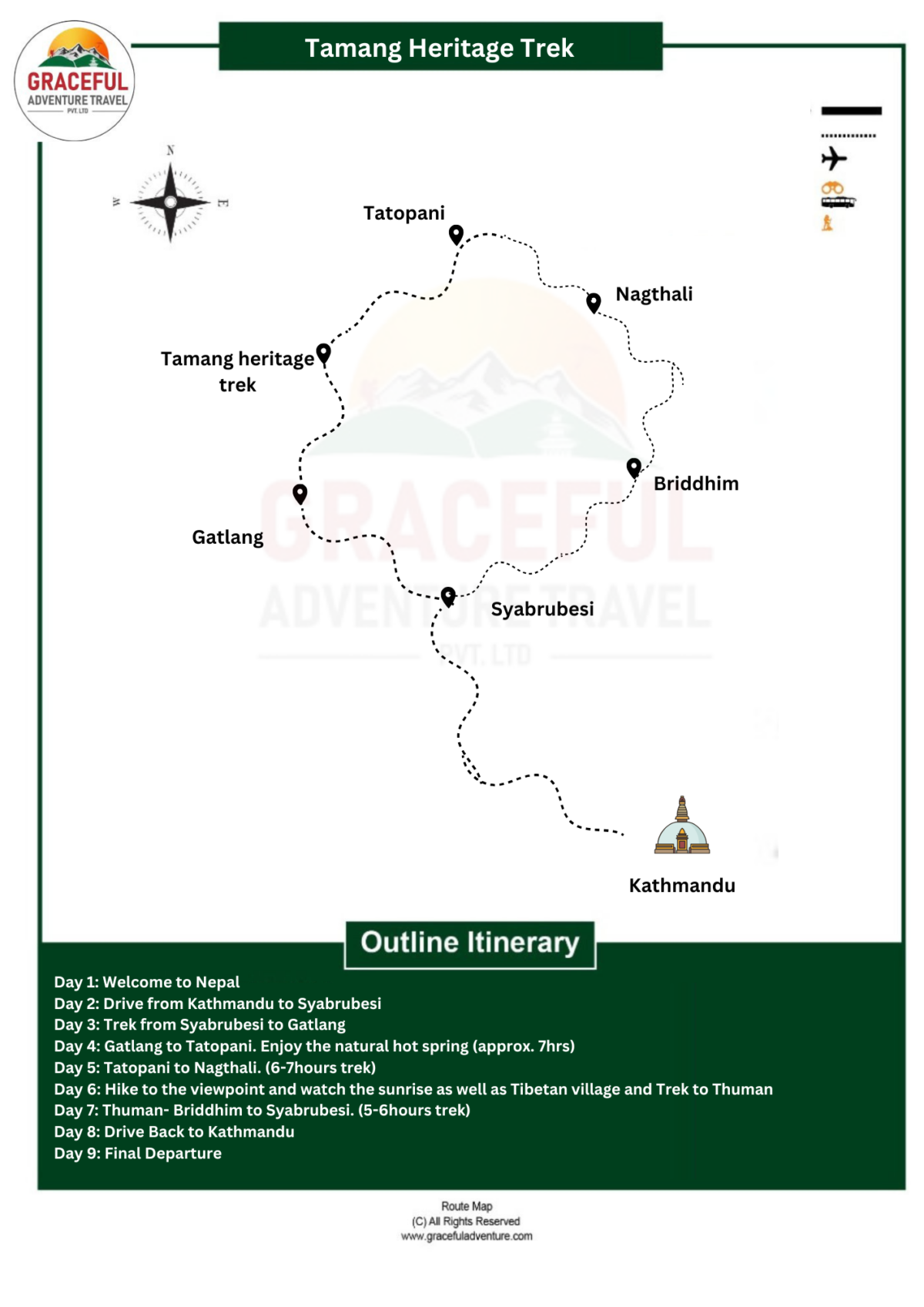 This Tamang Heritage Trek attains over 3,000 meters, where the trekkers might feel symptoms related to Acute Mountain Sickness (AMS), caused by the reduction of oxygen level at an altitude. The symptom includes dizziness, headache, nausea, and fatigue. To avoid these, one should pace themselves slowly, which allows the body to adjust to the thinner air. Drink plenty of water, maintain a healthy diet, and stay hydrated. Acclimatization days are provided in the itinerary for better acclimatization, and rest days can be used when needed.
