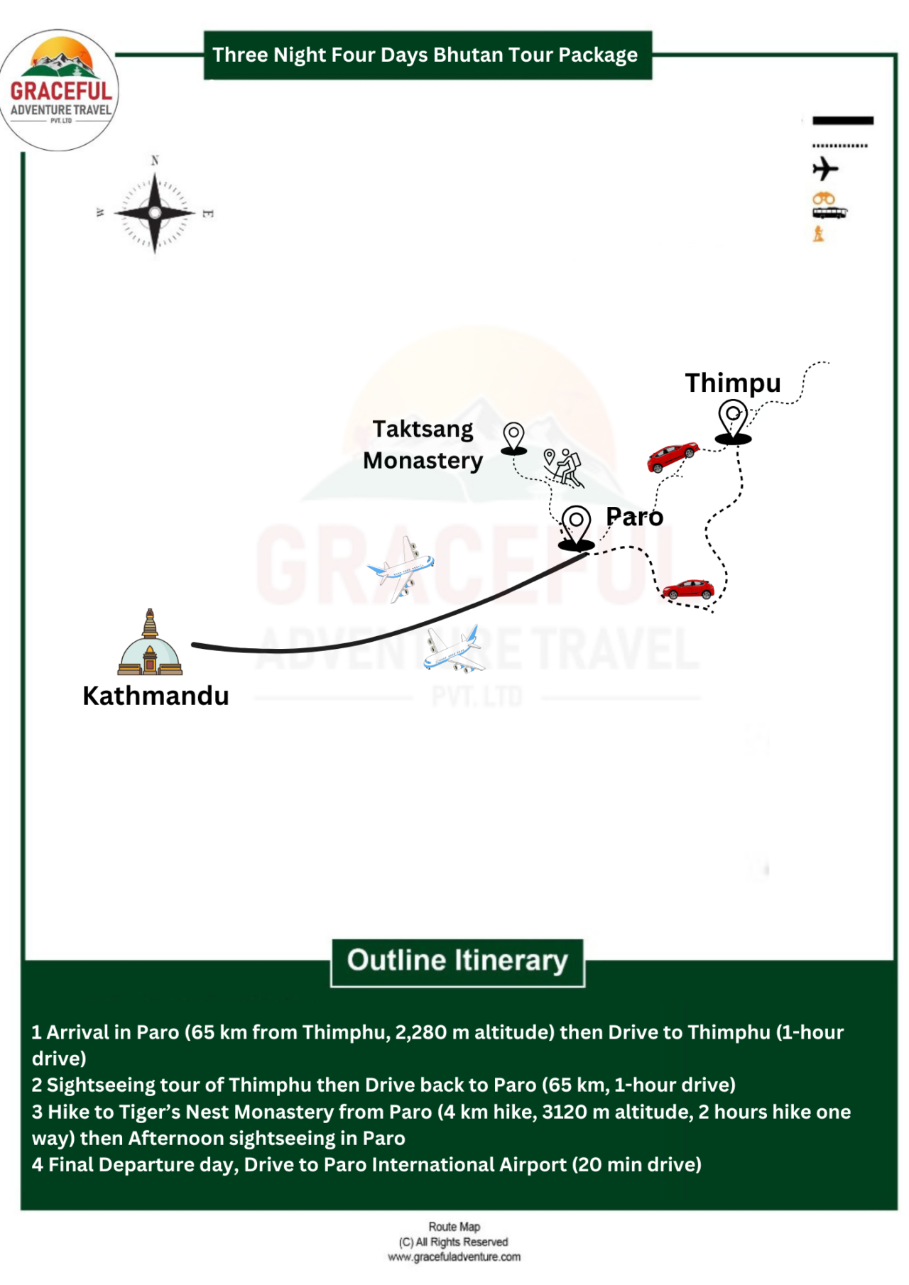 We have taken the time to design this 3-night, 4-day tour for you by Graceful Adventure Travel to make you feel at home, enriched, and unforgettable so that you can immerse yourself in the culture, nature, and spirituality of Bhutan. Graceful Adventure Travel is a Nepalese-based tour company catering to local and international tourists. We operate tours not only in Nepal but also have tours outside of Nepal on your demand, providing a customized and quality travel experience as per your requirement.