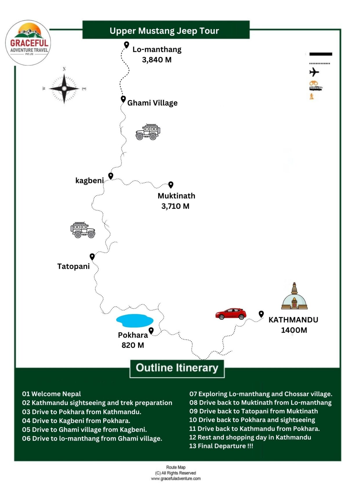 The entire Upper Mustang Jeep Tour is organized by Graceful Adventure Travel, a trusted local operator with deep expertise in high-altitude off-road tours. You’ll be driven in reliable 4×4 jeeps such as the Toyota Land Cruiser and Mahindra Scorpio, guided by professional drivers and experienced tour leaders.